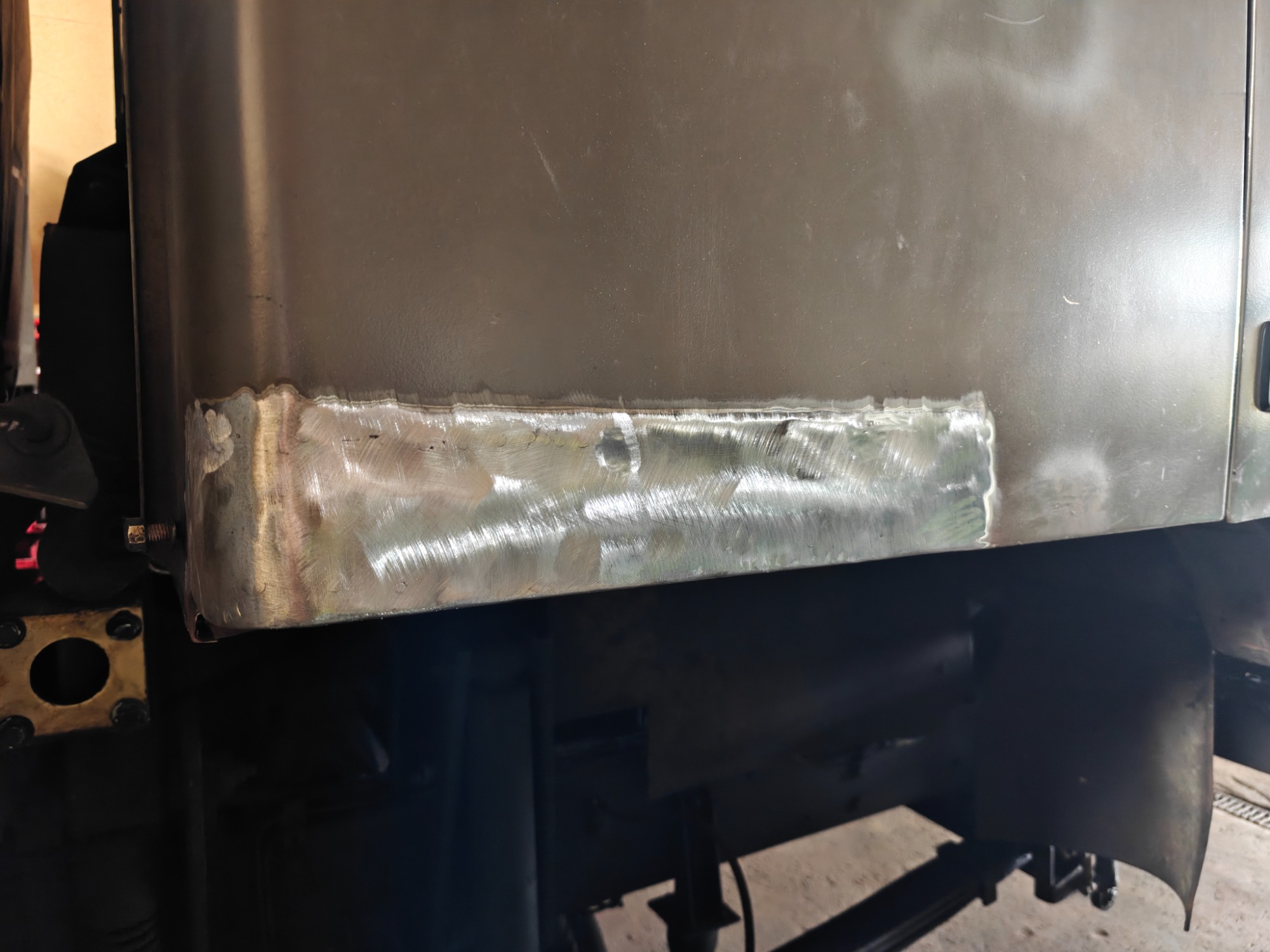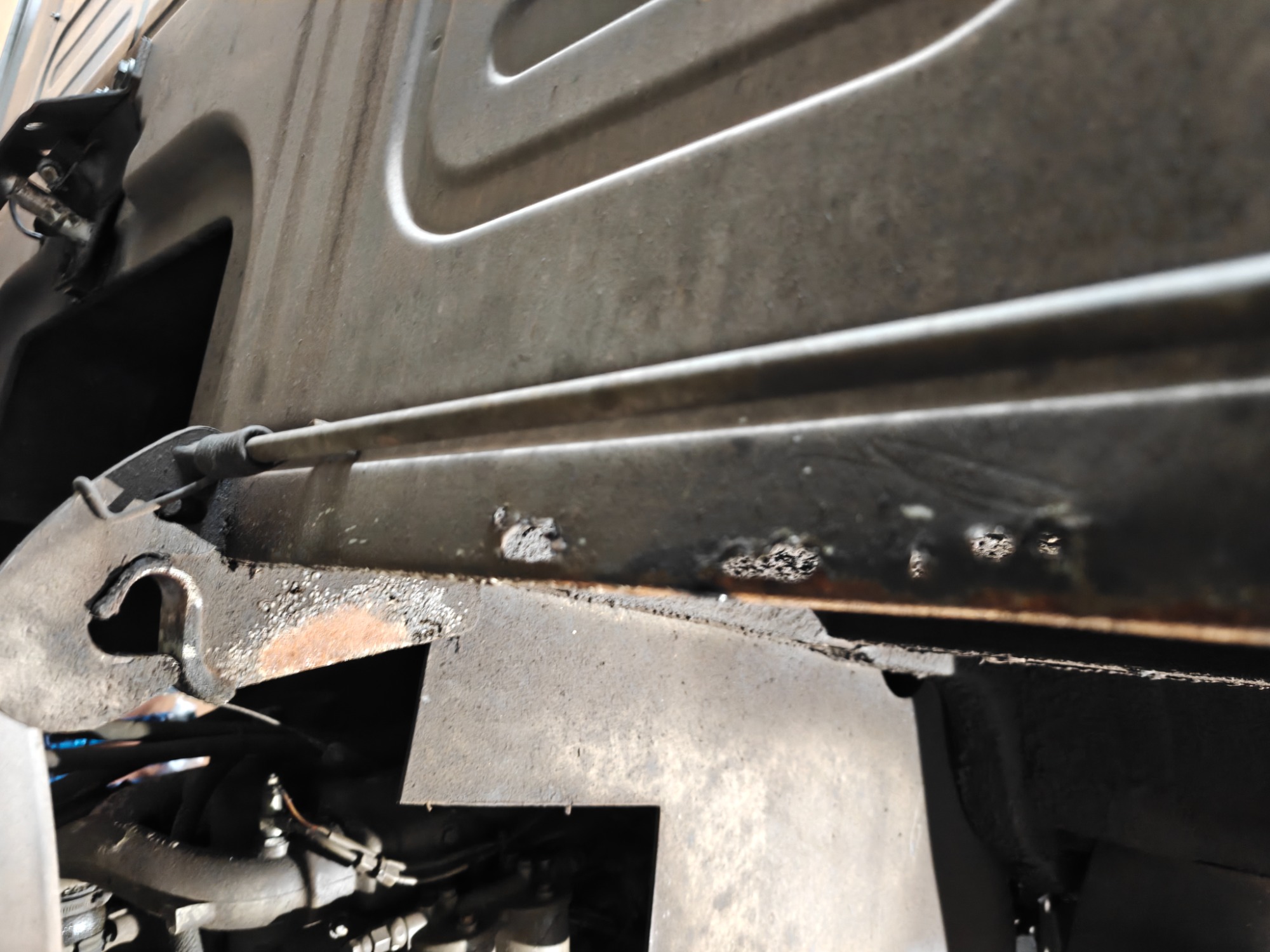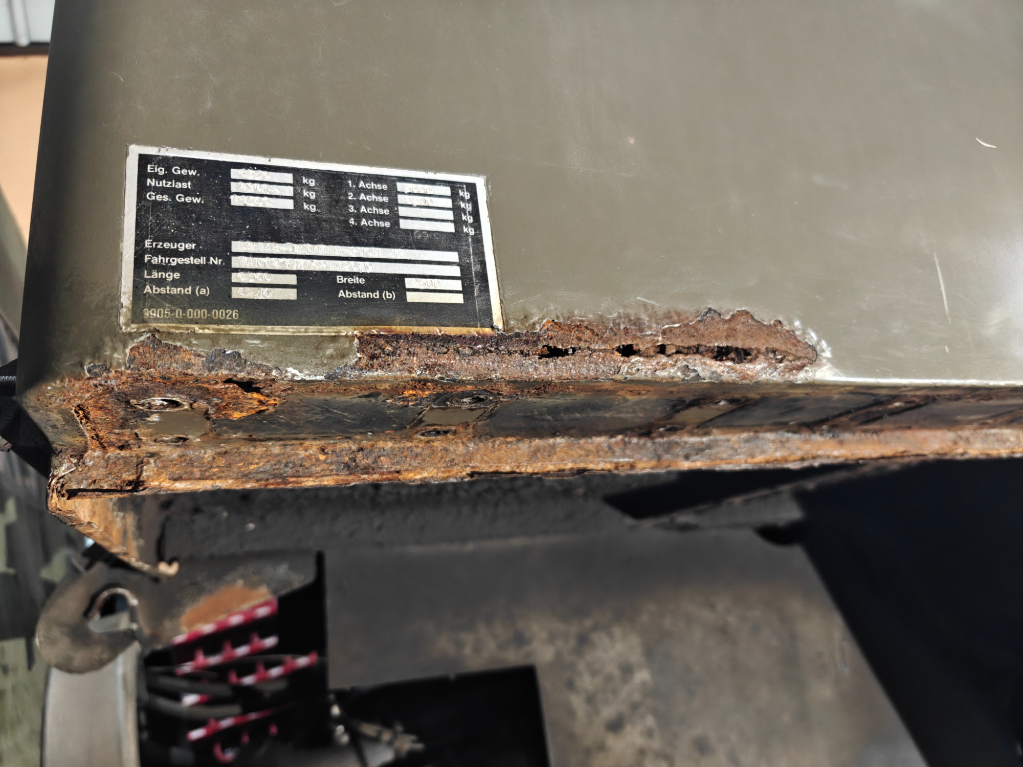 Beifahrerseite hinten da wo das Typenschild normalerweise sitzt war durch und wurde ersetzt. Ebenso in der selben Ecke an der Rückwand waren beim Senkrechten Falz nach dem Entfernen von Rost nur noch wenig Materialstärke vorhanden bzw. Waren schon Löcher drinnen.