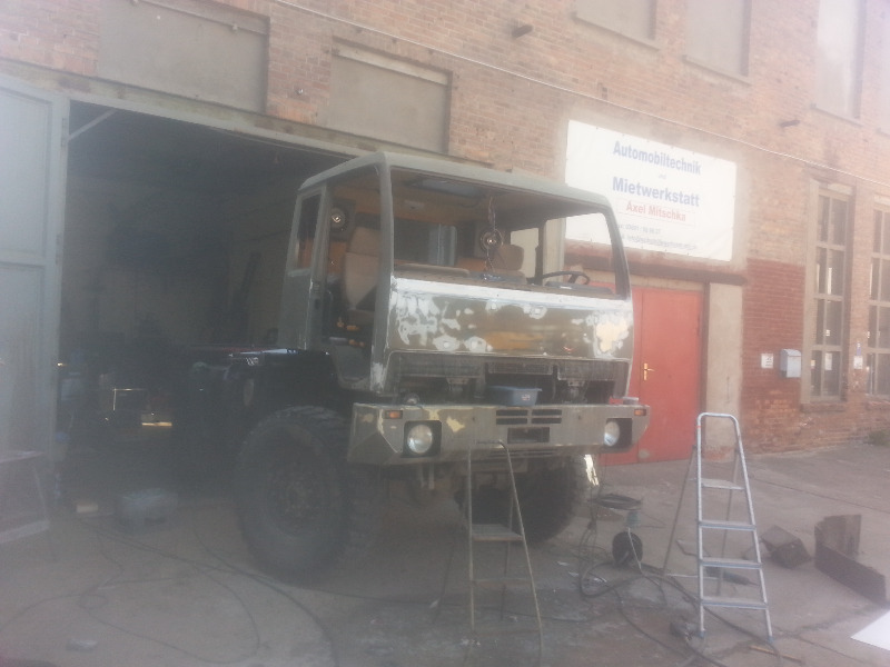 Vielleicht wäre es ja eine Alternative, das Fahrerhaus abzunehmen, es soll ja vermutlich eh noch lackiert werden. Ganz so schlimm ist es nicht und du könntest dann ggf. einen Rollbock bauen und es mit einem Autotrailer zum Lackierer schaffen. Für die Lackarbeiten wäre das super.