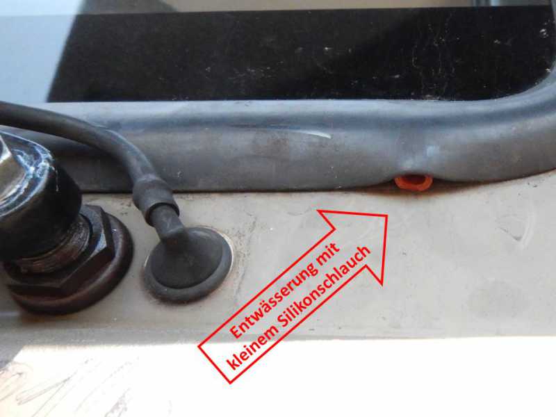 Beim Abheben des Scheibengummis ist eigentlich immer Wasser heraus gekommen, das habe ich mit einem kleinen Silikonschlauch den ich eingeklemmt habe gelöst ( Schnelllösung )