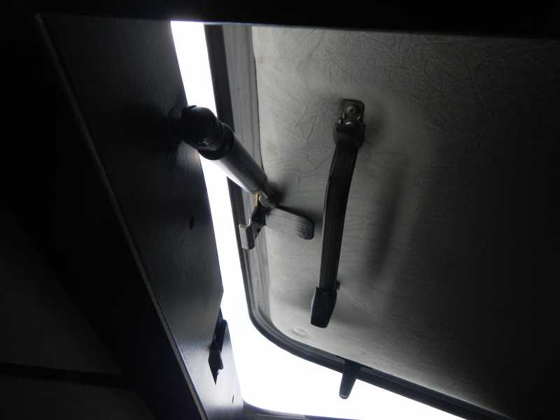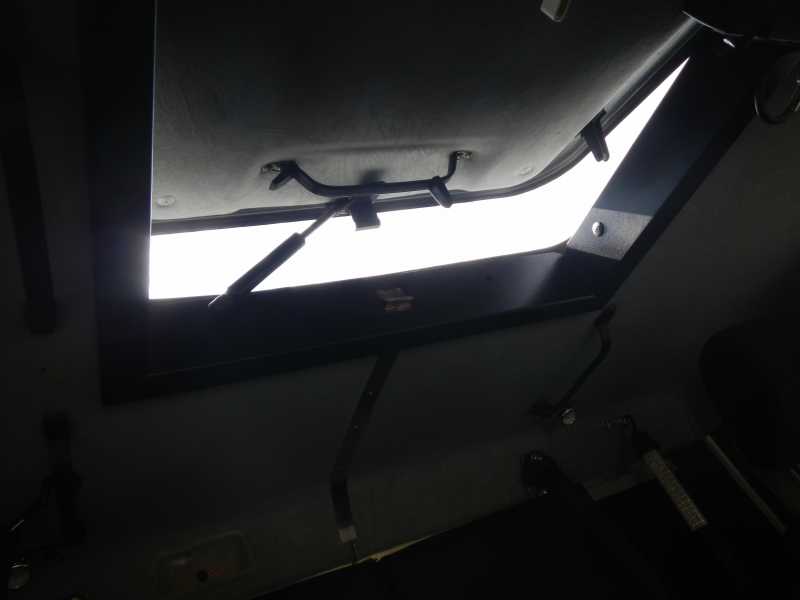 Ich vermute das die Federbleche mit den zwei Auslegern mit der kleinen Rolle unten an dem Dachlukendeckel zu tun haben. Ich konnte mir auf die Teile keinen Reim machen. Mit einer Gasdrucklosen Lösung wäre das erklärbar.