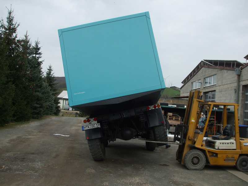 Es ging primar wie weit der (in dem Falle vorn nicht fixierte) Zwischenrahmen abheben wird, und wir weit die äußeren Enden der Traversen für die Containeraufnahme sich in Richtung Tank bzw. Staukasten bewegen.