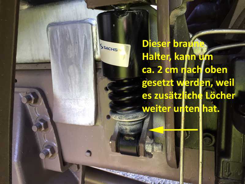 Weiter kann ich sagen, dass der untere Halter - ganz genial - zwei Löcher für die Befestigungsschrauben hat. Damit könnte man die Höhe nochmals um ca. 2cm raufsetzen. Wer also tonnenweise Material auf dem Dach hat, - das Fahrerhaus immer noch nach hinten neigt - , der könnte nach dem Dämpferwechsel nochmals erhöhen wenn nötig.