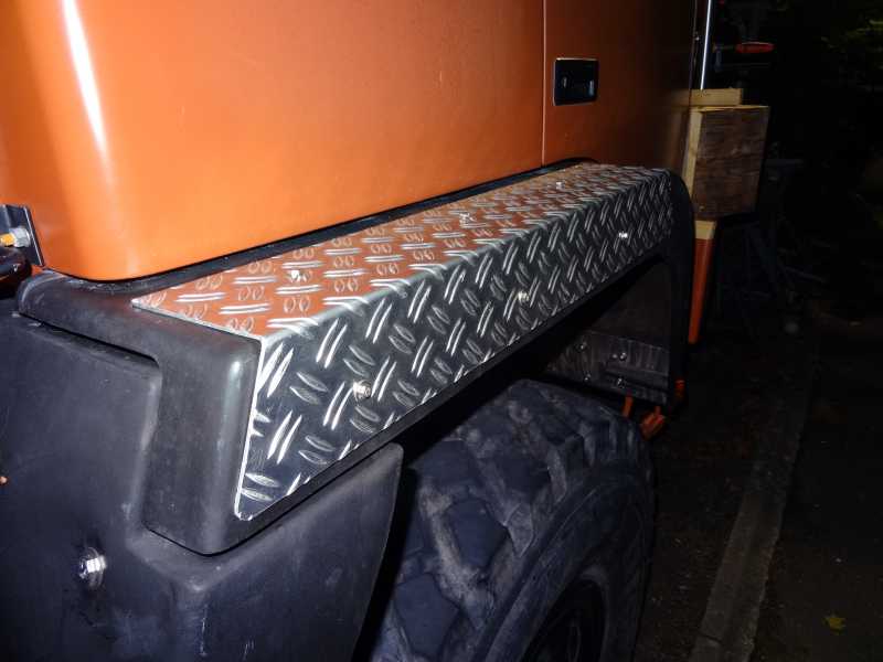 ich habe erst vor ein paar Wochen die Kotflügel wieder in Form gebracht. Hoffe, man kann es auf dem Foto vernünftig erkennen. Habe ein Aluriffel-Blech biegen lassen und es dann von oben in den bereits vorhandenen Löcher befestigt. War eigentlich eine ziemlich fixe Angelegenheit. Meiner Meinung nach hat diese Lösung den Vorteil, dass man sich mit dem Zurückbiegen der Kotflügel nicht all zu viel Arbeit machen muss (meine waren ganz schön heftig deformiert)