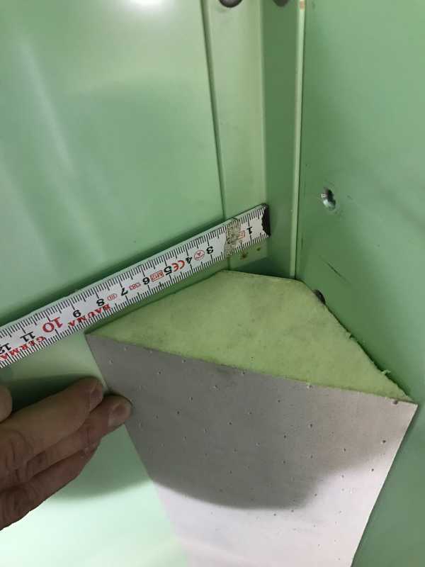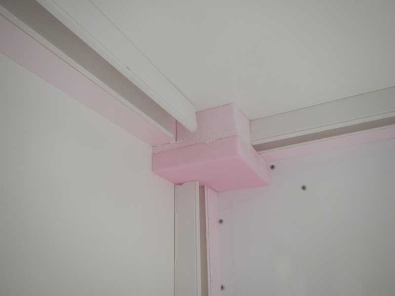 In die Ecken des Shelters klebe ich Hartschaumkeile. Die Keile ermöglichen eine gute Zirkulation der Luft hinter den Schränken, da es keine 90° Ecken gibt.