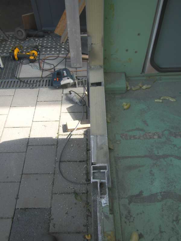 Dazu habe ich ein 2mm Aluminiumblech an die Rückwand genietet und zugleich mit Sika 252 verklebt. Die Rückwand wird später noch lackiert.