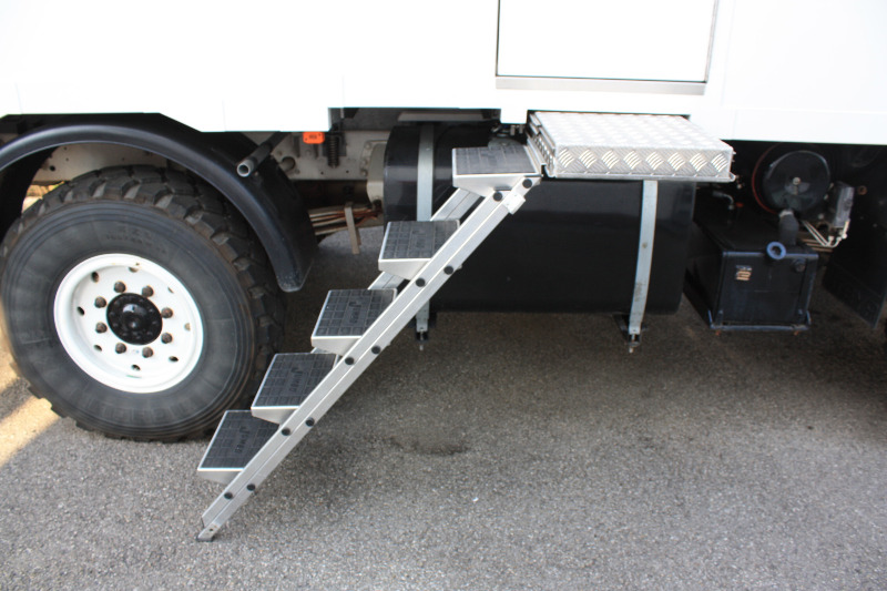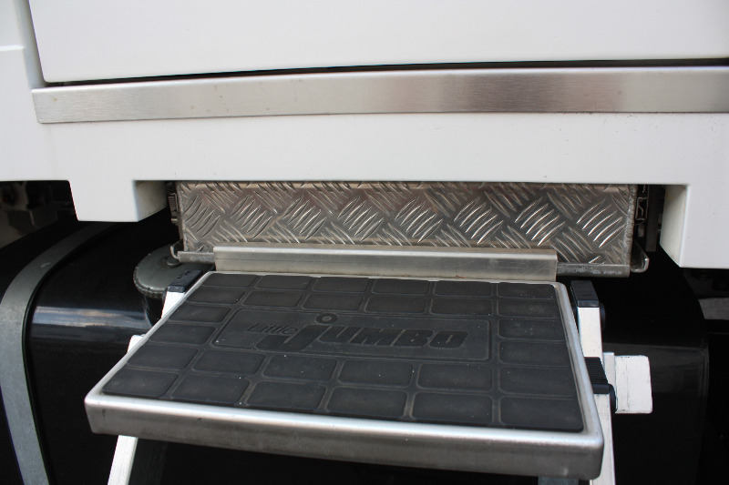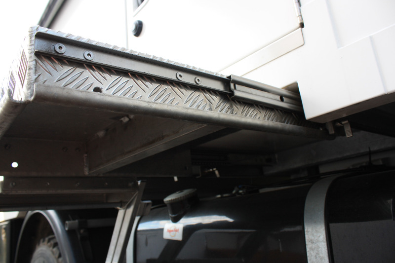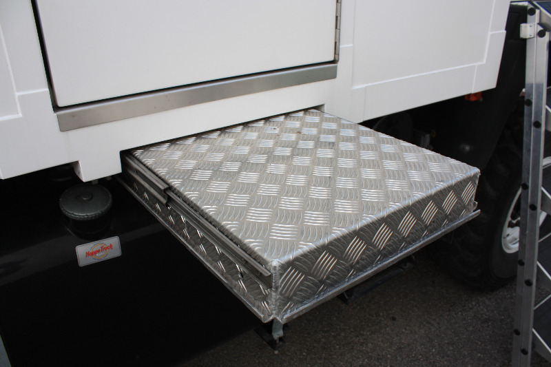 Glücklicherweise ist mir eine Hymertreppe (nicht Womo) über den Weg gelaufen,deren Stufen ich ausbauen konnte. Damit das ganze auch wirklich stabil ist haben wir 3mm Edelstahlrohr genommen. Insgesamt natürlich kein Leichtbau.