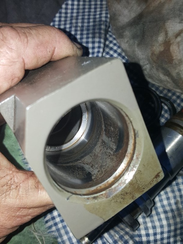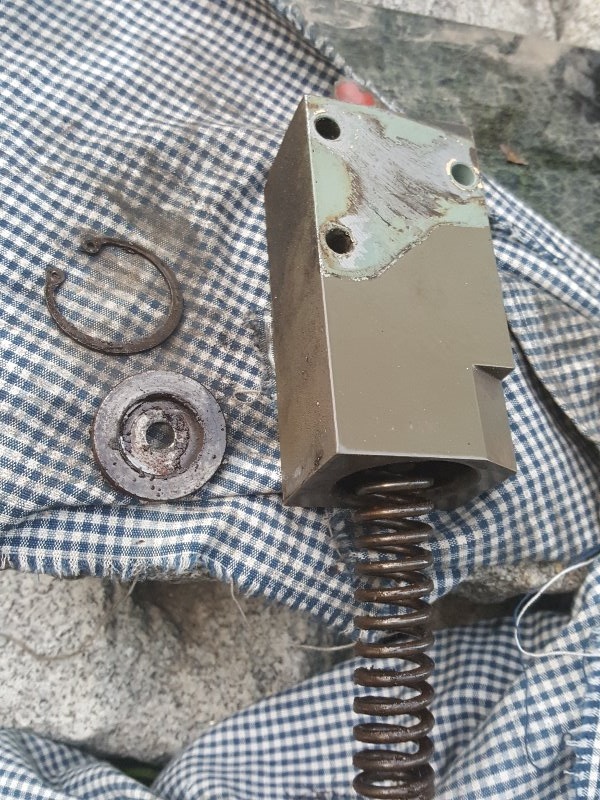 Abbauen und den Sägering hinten abnehmen. Den runden Stahldeckel aus dem Gesicht operieren, weil innen im Block eine starke Feder sitzt und die Deckelscheibe entgegenwirft. Alles war stark korridiert und mit schmutzigem Hydrauliköl verklebt.