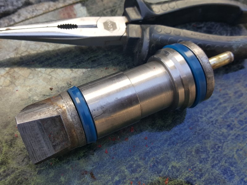 Das Überziehen der 2 Ringe ist schwierig. Heisses Wasser hilft. Das blaue Material gestaltet sich aber als sehr beschädigungsressistent. Beim Darüberhebeln in die Nut des Kolbens.