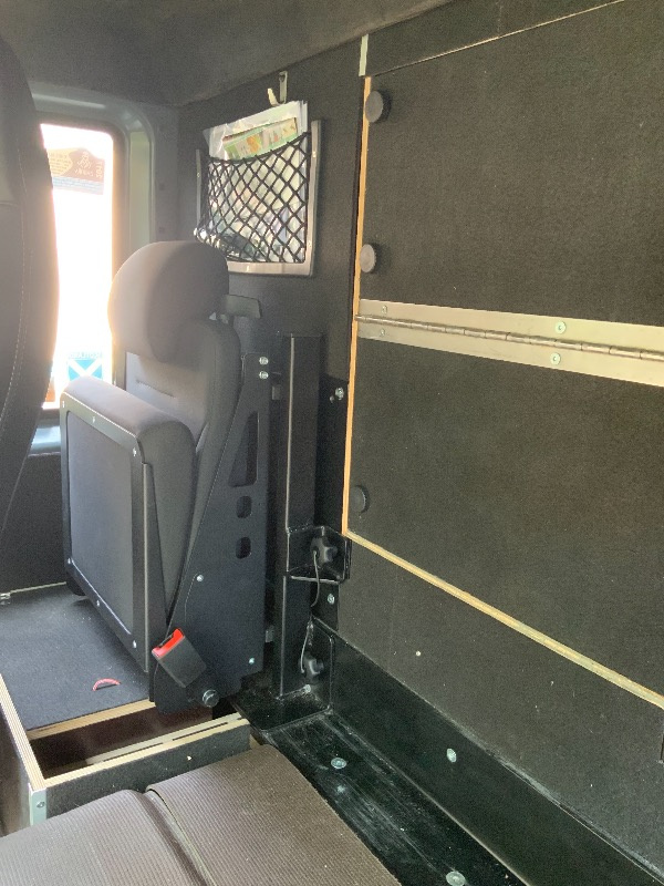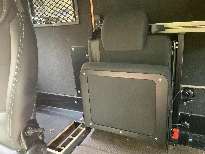 Dass der Sitz „mobil“ ist war überhaupt kein Problem. Wird der Sitz nicht benötigt kommt er raus, oder geht in die „Parkposition“ hinter den Beifahrersitz. Für diesen Vorgang brauche ich ca. 2-3 Minuten. Ich bin zufrieden, jetzt passt alles.
