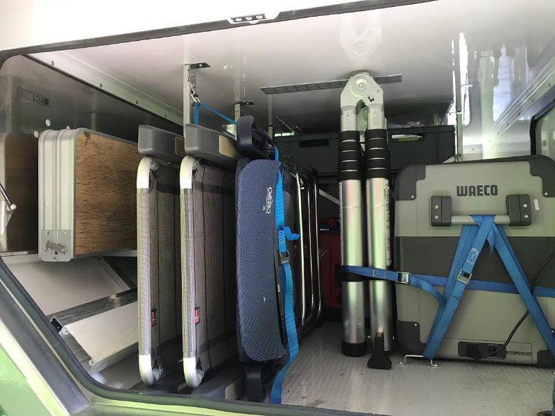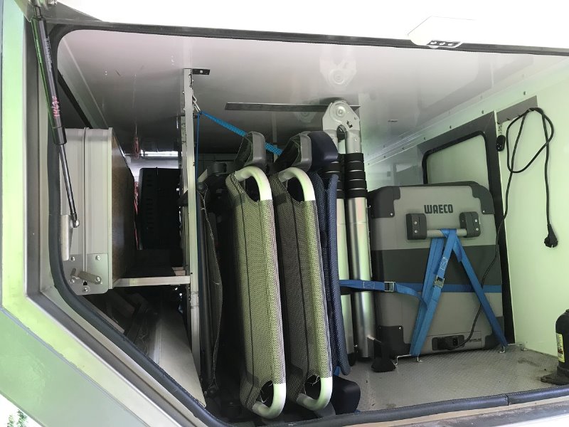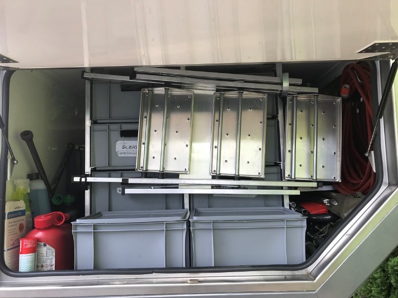 Die Schräge hinten unten wird für lange Gegenstände genutzt - z.B. Stangen f. die Markise, Tarnnetz, etc.