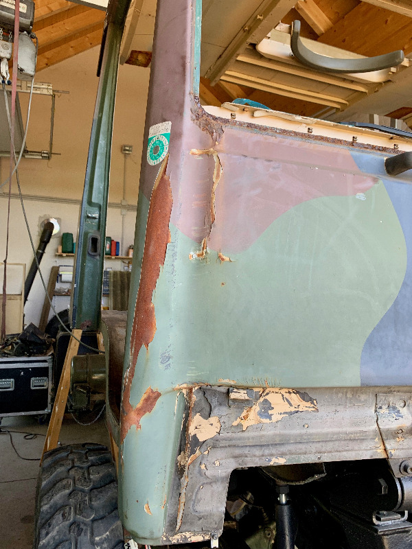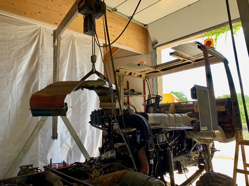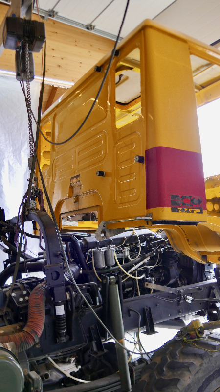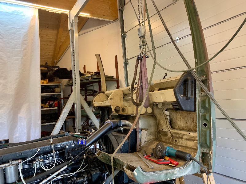 Neues Fahrerhaus ist aufgesetzt und provisorisch montiert. Den Lagerbock nehme ich vom neuen Faherhaus da mir genau die 2 Schrauben abgerissen sind die direkt im Lagerbock das Gewinde habe. Ich werde bei dieser Gelegenheit auch gleich neue Lager einbauen. Schnittkante ist angerissen, nächste Woche werde ich schneiden und hoffentlich zu schweissen beginnen. Ich möchte versuchen so schnell zu sein das ich, solange es noch halbwegs warm ist, zumindest Spachteln und Grundieren schaffe.