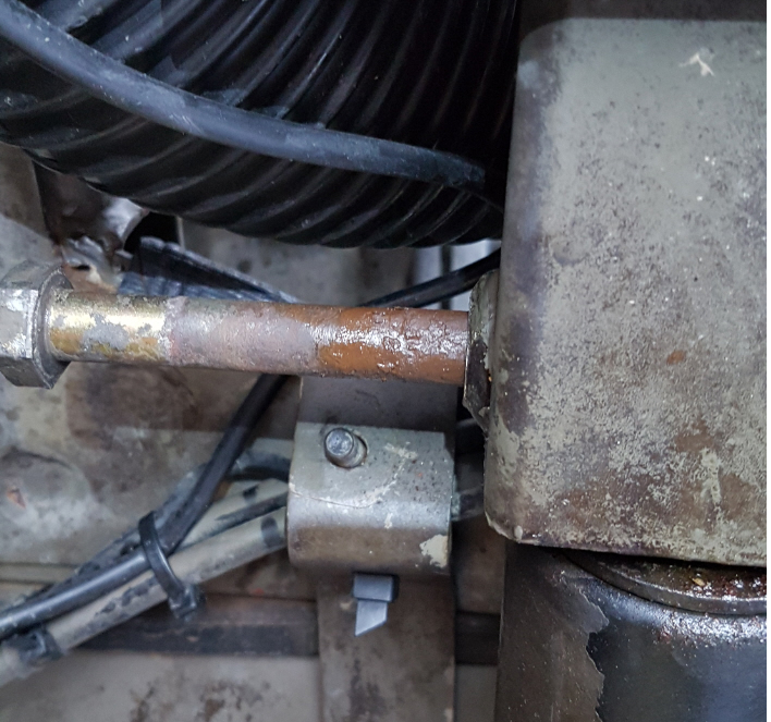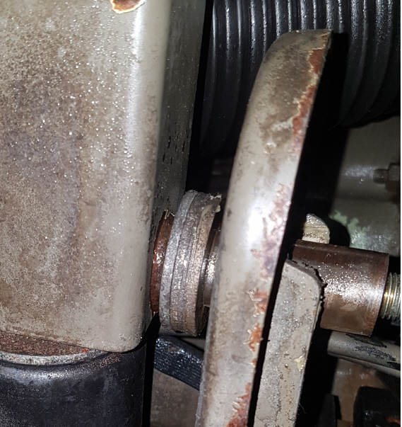 Bild 2: In diesem Bild sieht man das u.a. die Hülse des Führungslagers auch fest war. Wir haben dann links von den Unterlegscheiben das oben genannte Werkzeug angesetzt und mit einem ausgewachsenen Hammer die rechte Hülse und die festgegammelten Unterlegscheiben gelöst. Dabei immer die Schraube gedreht.