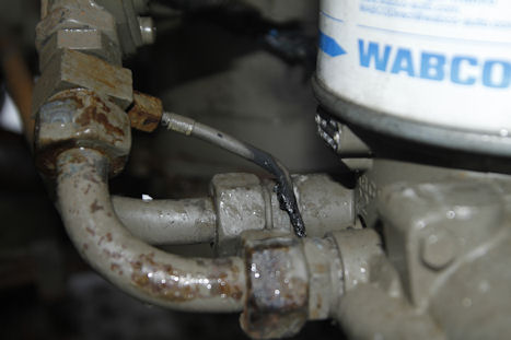 3. Leicht links hinter dem Lufttrockner, geht von der Bremsleitung noch ein kleiner Schlauch (Durchmesser kleiner 1 cm) rechts ab und verschweindet unter dem Wagen (Bild 9888). Wofür ist der und wo bekomme ich Ersatz??