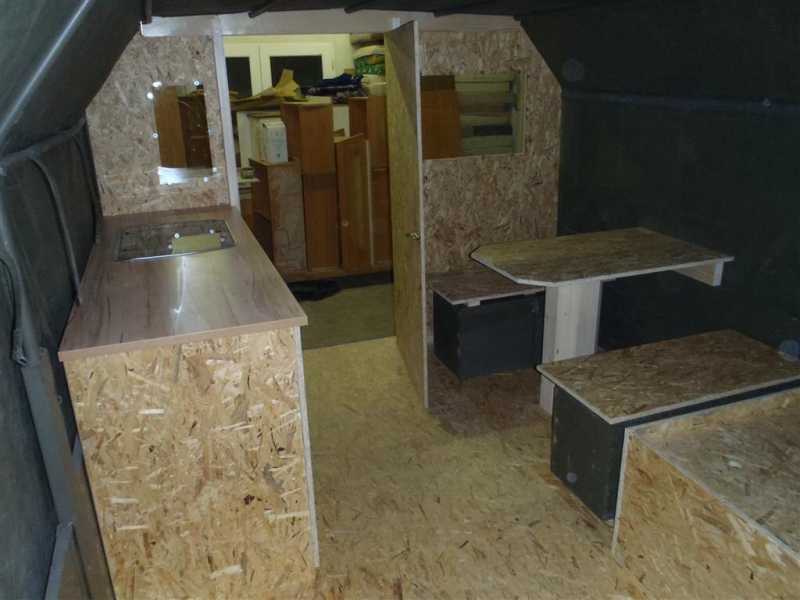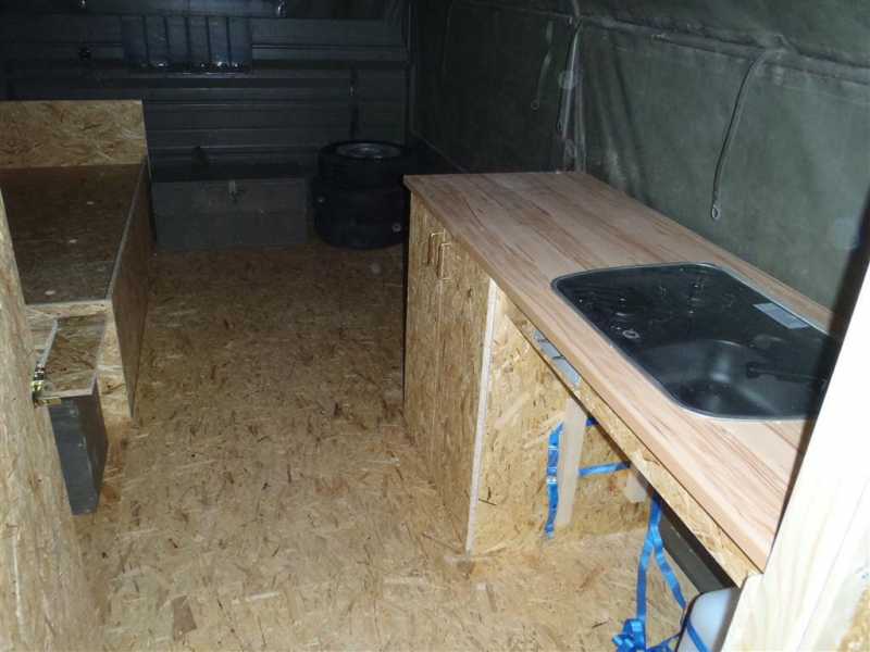 Einfacher Ausbau mit Bett, Sitzgelegenheit, Unterschrank mit Gas - Spülkombination und 2 Wasserkanister.