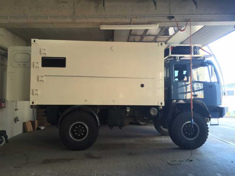 DerAufbau und das Fahrerhaus sind vom Lackierer neulackiert worden. Wir sind in ca. 1 Woche wieder in Deutschland, da hab ich wieder richtiges Netz.