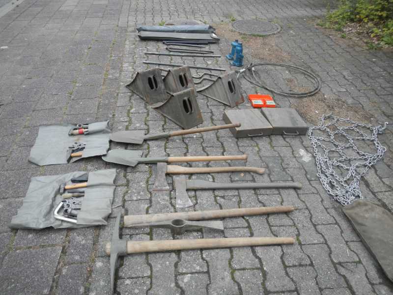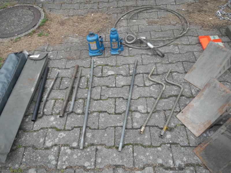 Wagenheber, Unterlegplatte, die Keile und das stählerne Abschleppseil.