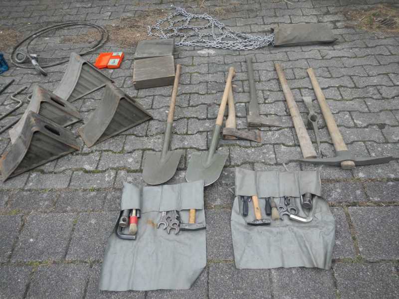 =Axt, Spaten, Spitzhacke (der eine geschwungenere Axtstiel wurde vom Militär ersetzt, ob dieser in die Halterung passt, wäre erst noch auszuprobieren)