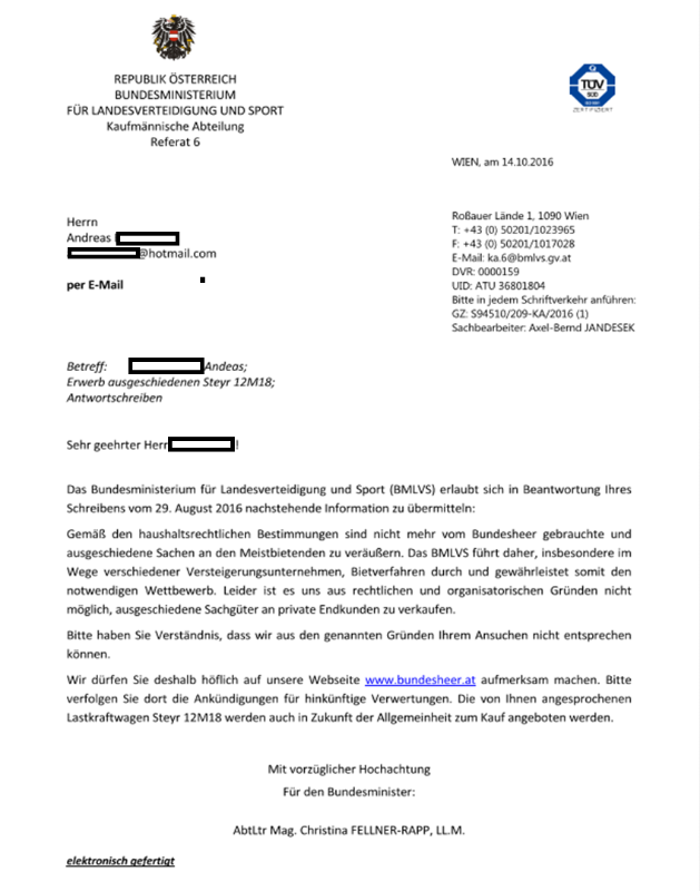 Ja - ich habe meinen 12 M 18 aus Wien und möglicherweise ist er der besagte teure. Zuvor war ich in Graz und habe mir dort die 12 er angeschaut. Ich konnte allerdings in Erfahrung bringen, dass im Frühjahr letzten Jahres mehrere scheckheftgepflegte 12 er zur Versteigerung kommen sollen. Also habe ich meine gelbe Bieterkarte nicht hochgehoben und wollte im Frühjahr letzten Jahres dann zuschlagen. Allerdings hat sich das Bundesheer anders entschieden und es kamen keine mehr. Als in Wien dann 3 zur Ausschreibung kamen bin ich hingefahren und habe auf der Auktion meine Bieterkarte nicht mehr runter genommen bis ich ihn hatte. Ich kann nur allen empfehlen es so zu machen. Ihr habt es in der Hand, was ihr kauft und seid auf niemanden angewiesen.