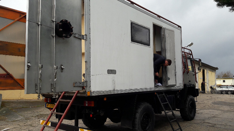 Der Koffer hat am Heck 2 große Flügeltüren befestigt an einem Edestahlportal. Auf der linken Seite gibt es einen Ausschnitt für ein Fenster. Auf der rechten Seite einen Auschnitt für ein Fenster und eine Tür. An der Frontseite einen kleinen Auschnitt, dort wo einmal das Kühlaggregat montiert war. Der Koffer ist innen leer.