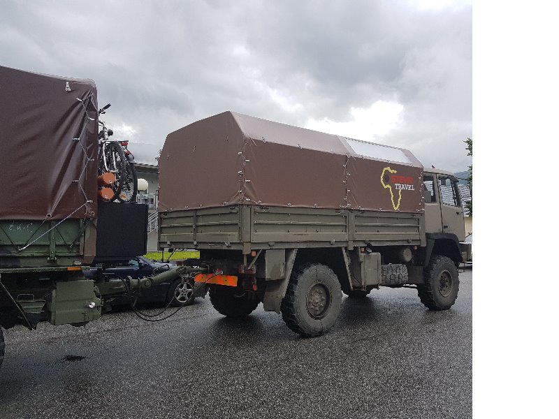 Ich habe Sie 2016 anfertigen lassen da die Originale (grüne) nicht dicht war. Seit dem war ich in Kroatien und Norwegen damit im Urlaub. Die Plane ist rings um, mit Schleuderschnur und Butterflyverschlüssen, aus reißfester LKW Plane hergestellt. Außen ist die Plane braun und innen weiß. Dadurch wirkt es direkt viel geräumiger. Im Vorderen Bereich habe ich 2 große Fenster in den Schrägen einbauen lassen und eines für die Sicht auf die Ladefläche, hinter dem Fahrerhaus.