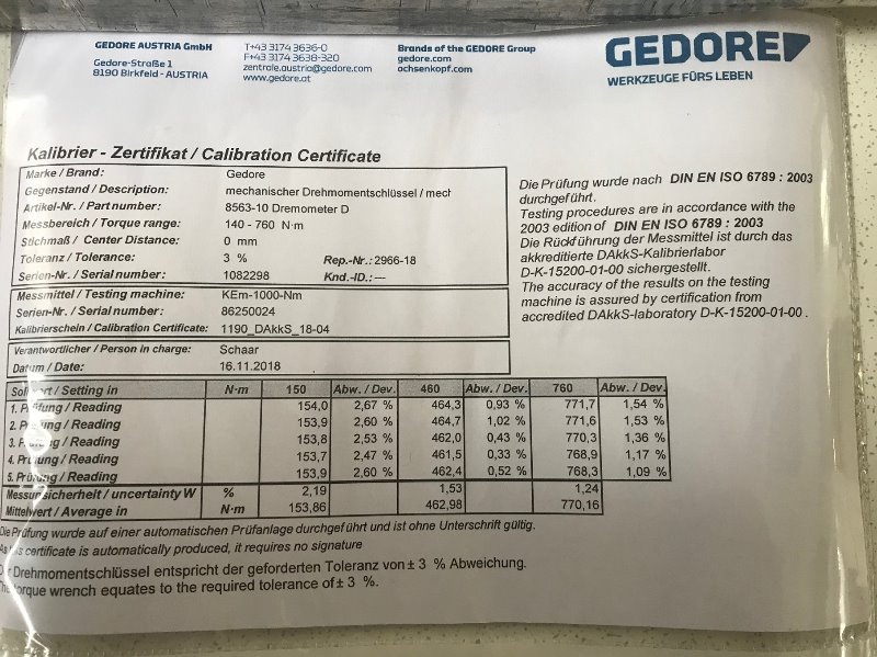 Ich möchte nochmals darauf hinweisen dass die Drehmomentschlüssel frisch aus dem Werk kommen: servisiert, werkskalibriert inkl. Zertifikat von 11/2018.