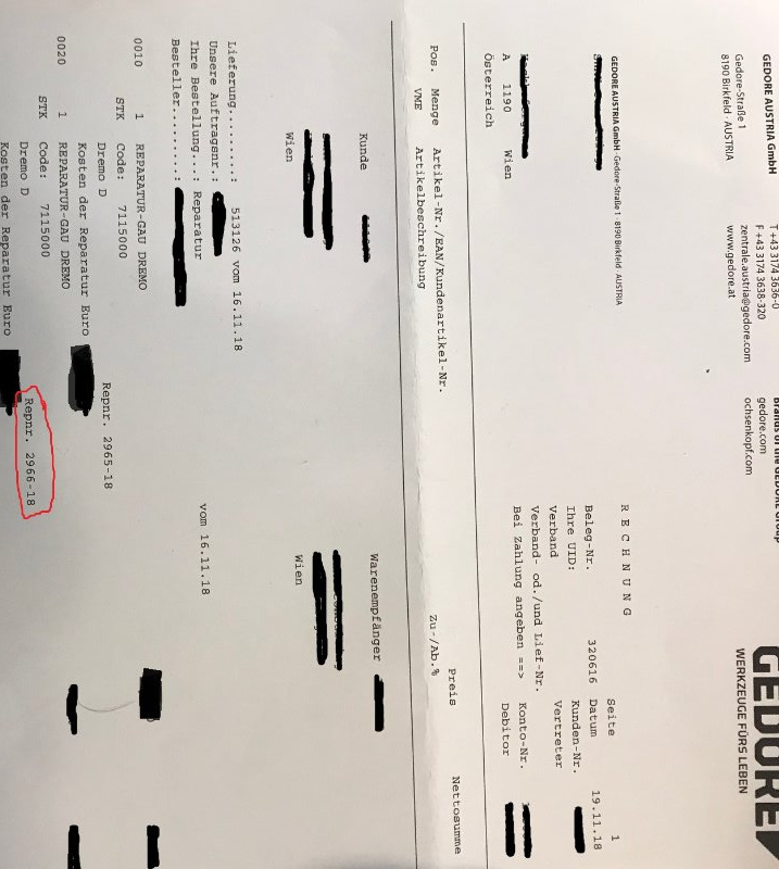 Selbstverständlich kann ich eine Rechnung von Gedore vorweisen - da ist eine Reparaturnummer drauf die auch am Dremometer aufgebracht ist.