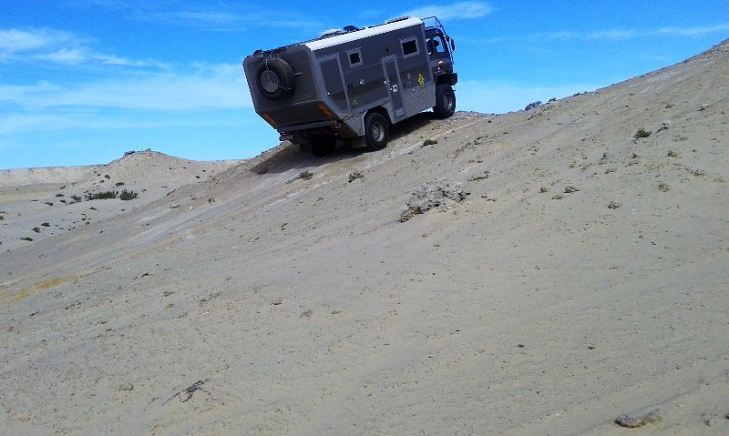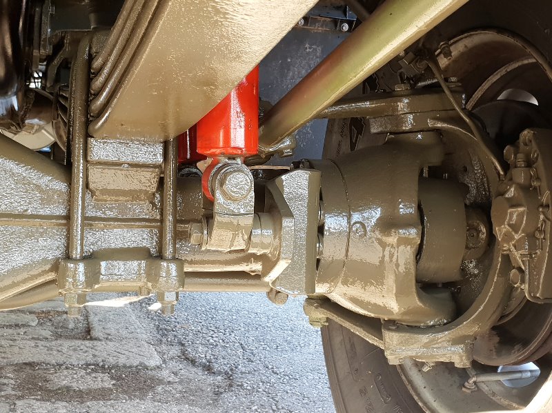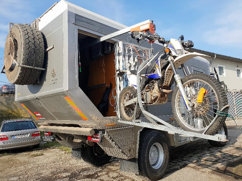 Da er einen Meter länger als normal ist, konnten auch etwas ausgefallene Ideen wie Motorradgarage mit elektr Lift, stärkere Federung, mehr Stossdämpfer etc etc verwirklicht werden.