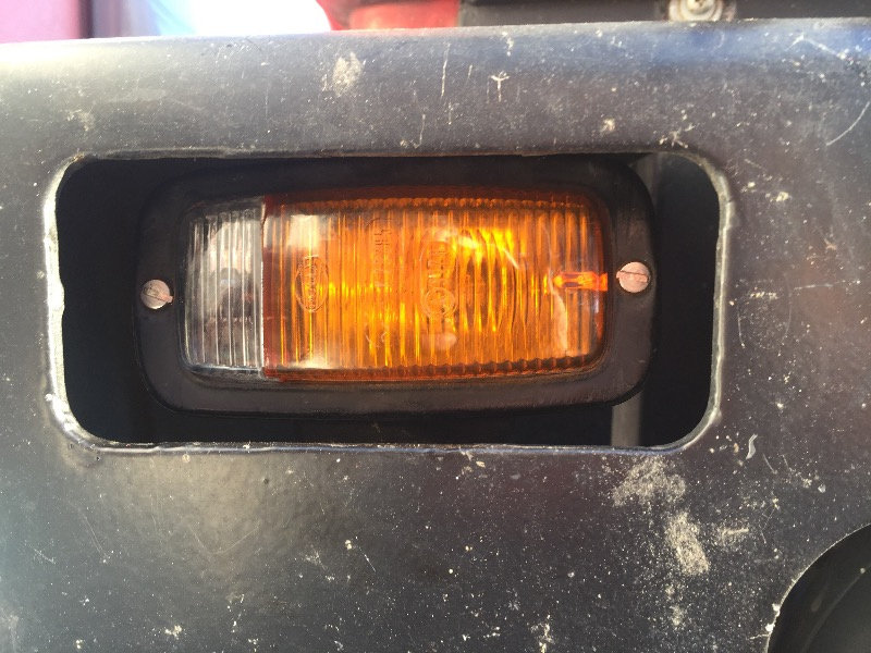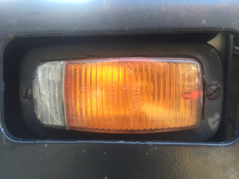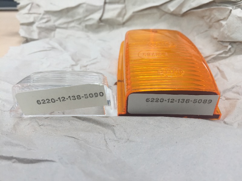 in der originalen Stoßstange sind Leuchten verbaut, die man wohl auch im Unimog oder in anderen Fahrzeugen findet. Eine Kombination aus Standlicht (weiße Scheibe) und Blinker (gelbe Scheibe) in einem Gehäuse. Die Innereien sind bei mir in Ordnung bzw. reparierbar. Der weiße Teil der Scheibe ist aber beidseitig gerissen.
