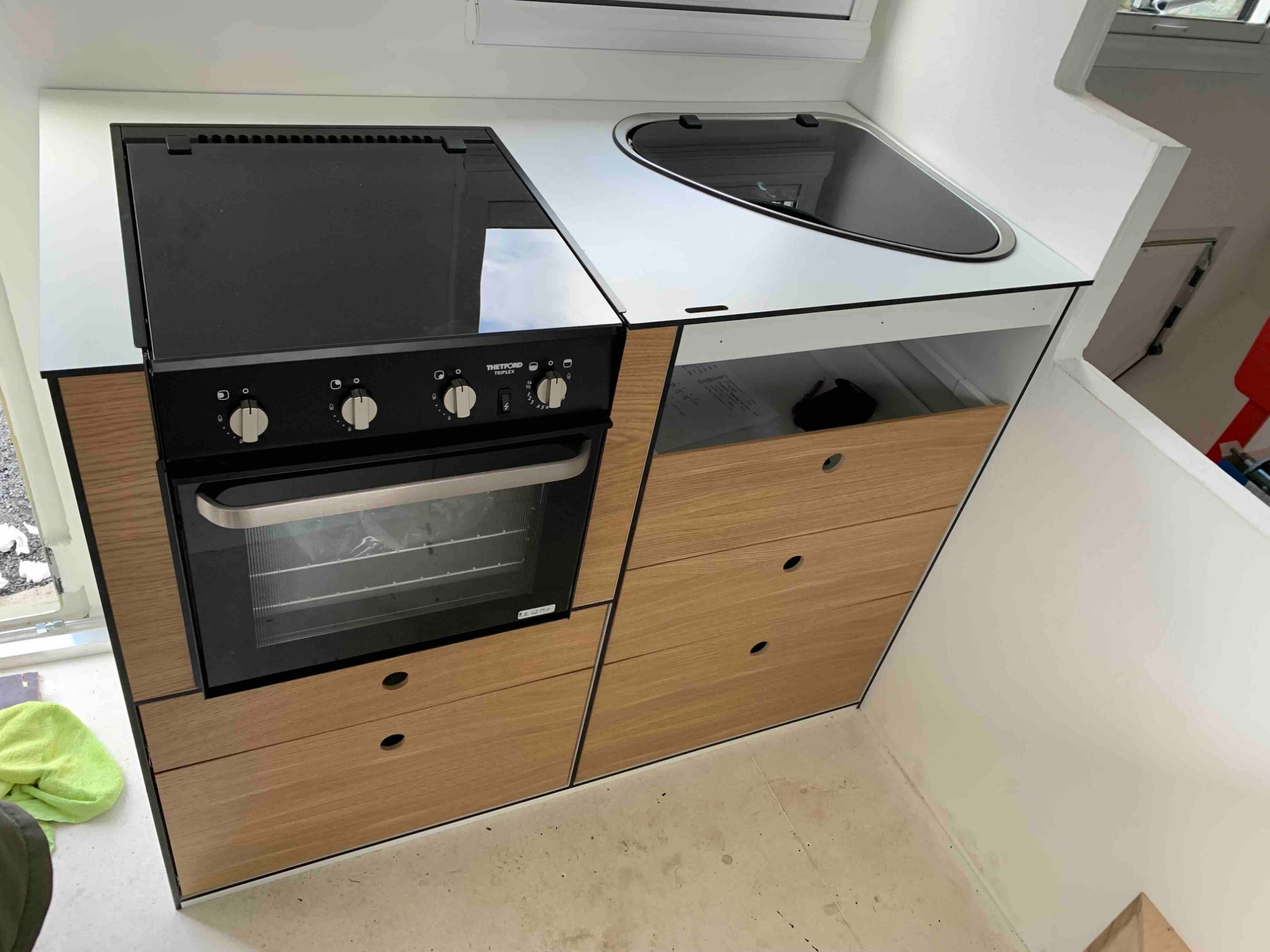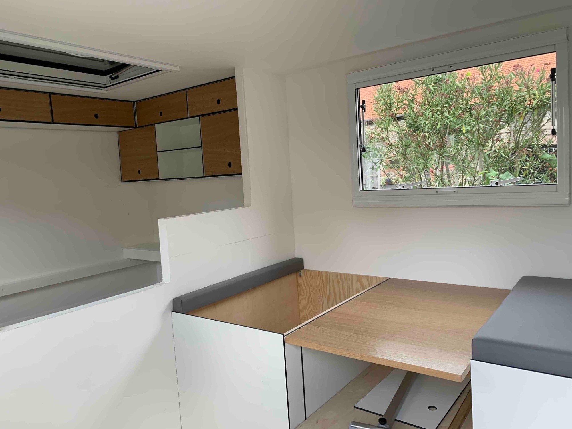 Kabine: Selbstausgebaute Siebdruck Kabine 60 mm, 4,50×2,50×1,93; drei Betten (1,40 x 2,0, 1,80 x 0,9), Küche mit Backofen, Gasherd 3 Flammen, Kühlschrank mit Gefrierfach 3Sterne, Dinette mit vier Sitzen, Trockentrenntoilette, Dusche, Waschbecken, Elgena Boiler 24/220V, 230LWasser, 700W PV, 5,4kWH LiPo Akku, Victron Wechselrichter/Solar/Shunt/Ladebooster (24V vom Fahrzeug, wenn keine Sonne scheint), Refleks Ofen (Diesel), LED Beleuchtung, USB, uvm.