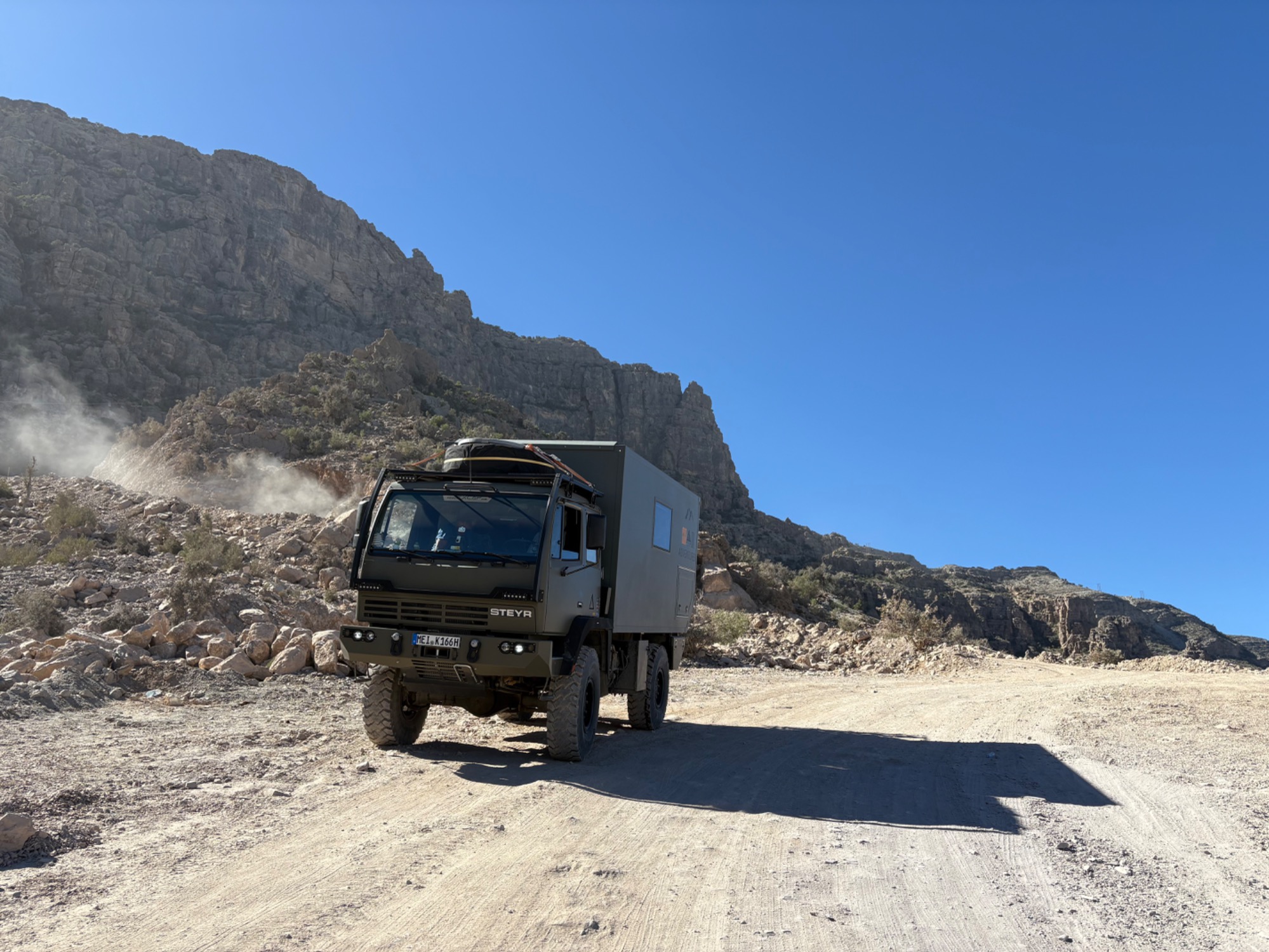 Die Piste ist gut gepflegt und meistens ziemlich breit und lies sich immer gut fahren. Kurz vor Bait Bima wurde es nochmal richtig steil und etwas enger, aber auch das lies sich gut fahren. Es geht am Anfang gleich steil bergab aber nichts was den Steyr überfordert. Mit Untersetzung im zweiten Gang und Motorbremse konnten alle Steilstücke gut gefahren werden.