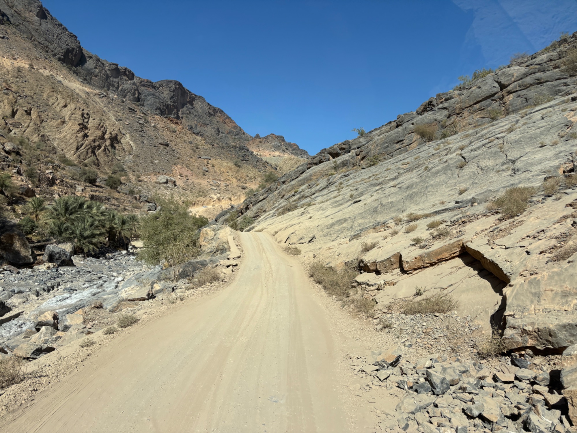 Von unserem Übernachtungsplatz Bait Bima geht es noch mal ziemlich steil Bergauf und dann wieder steil runter bis man unten im Flussbett des Wadi Bani Awf angelangt. An den Koordinaten 23.25769, 57.44101 gabelt sich die Piste. Fährt man hier links kommt man direkt weiter ins Wadi Sahtan.