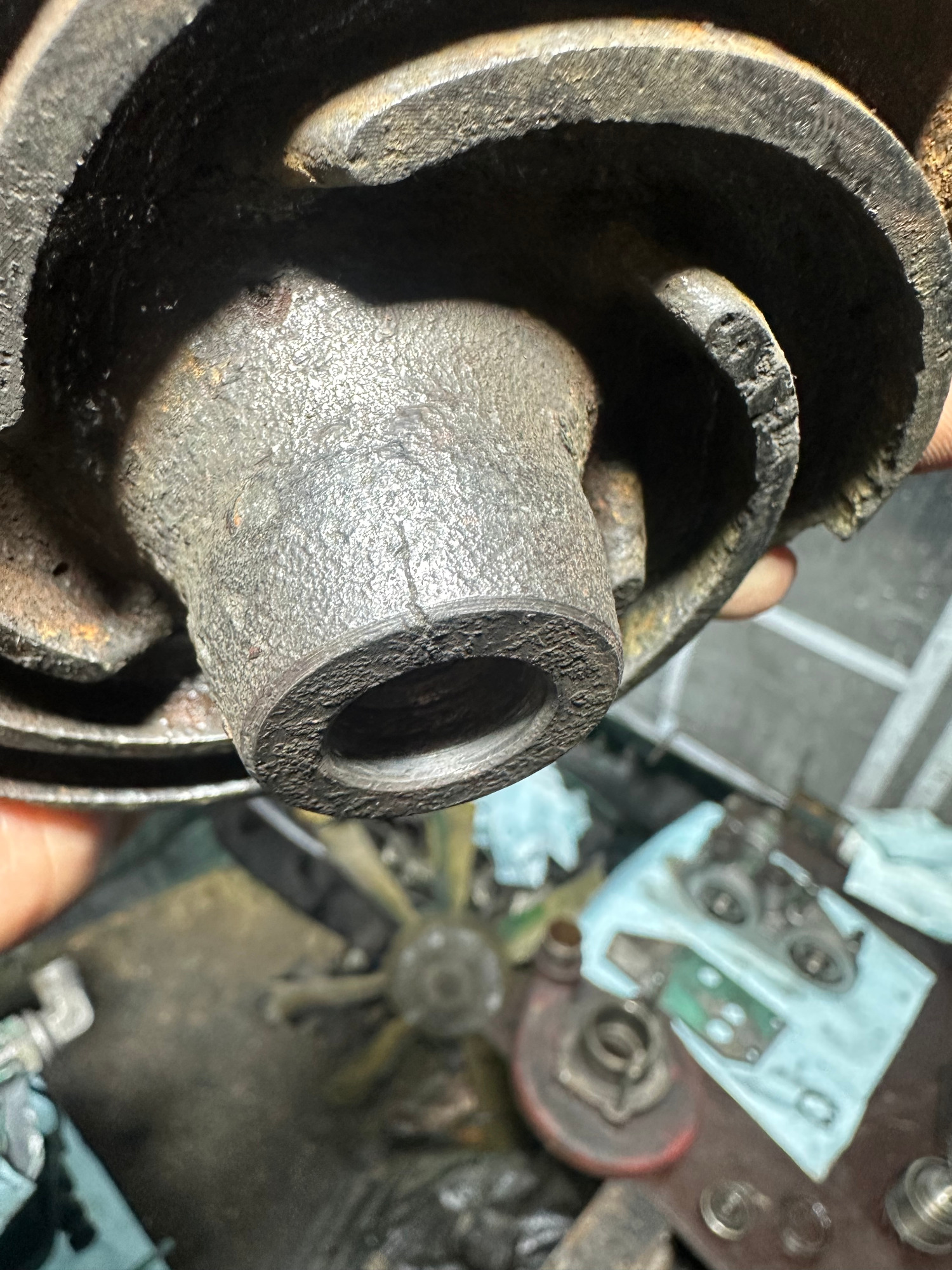 Die Pumpe somit nicht mehr angetrieben und nicht mehr funktionsfähig. Man sieht auch schön den Entlastungsbruch auf der Nabe des Pumpenrades.