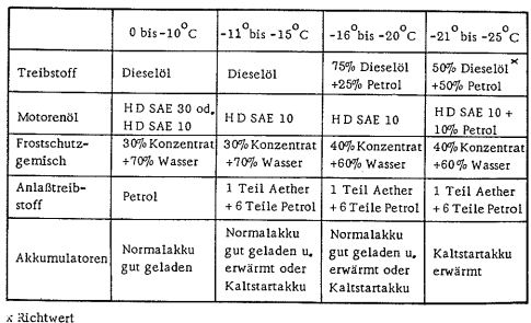 Je nach Temperatur gehört da auch Äther rein. Ab -11°C 1 Teil Äther und 6 Teile Petrol. Bei -16° soll auch 25% Petrol in den Krafstofftank, unter -25°C sollen es 50% sein. So steht es in der Betriebsanleitung.